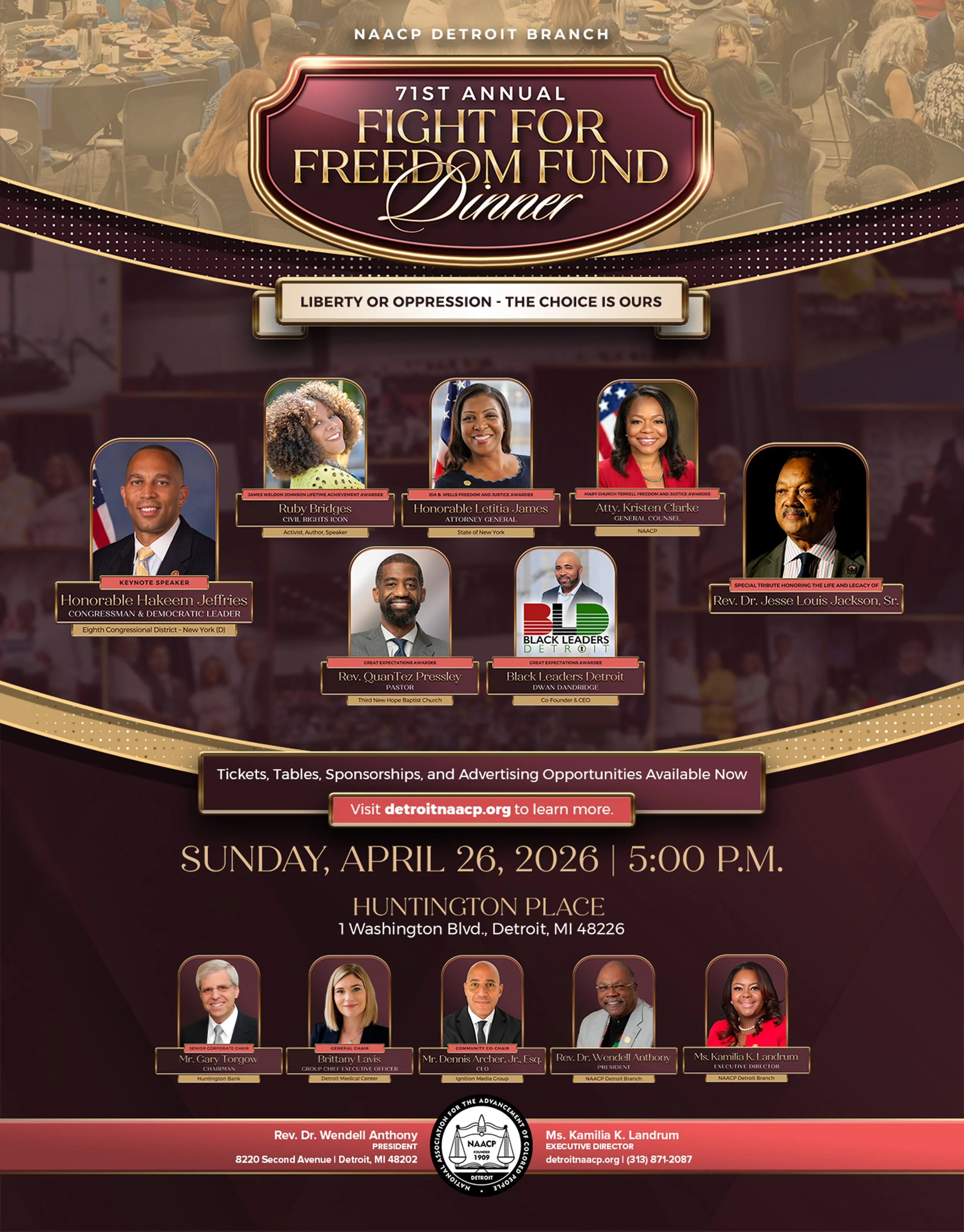 The NAACP Detroit Branch is home to one of the premier events in the world, the annual Fight For Freedom Fund Dinner. The NAACP Detroit Branch Freedom Fund Dinner provides its guests with a first-class meal, top notch entertainment, and some of the world’s renowned keynote speakers.
