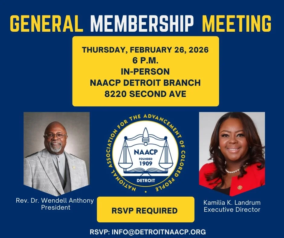 Back to All Events GENERAL MEMBERSHIP MEETING Thursday, February 26, 2026 6:00 PM 7:00 PM Detroit Branch NAACP 8220 2nd Avenue Detroit, MI, 48202 United States (map) Google Calendar ICS RSVP HERE