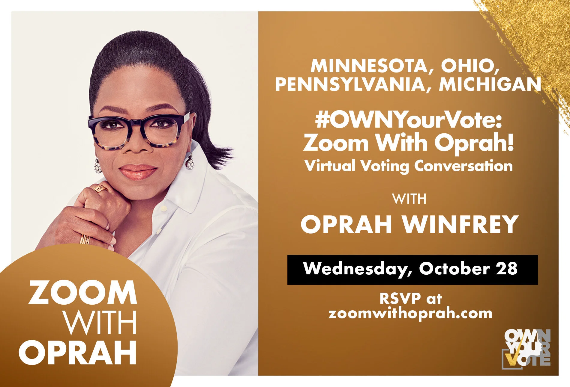 Back to All Events #OWNYOURVOTE — ZOOM WITH OPRAH Wednesday, October 28, 2020 8:00 PM 9:00 PM Google Calendar ICS Tune in on Wednesday, October 28 at 8 p.m. for #OWNYourVote with Oprah Winfrey. Detroit Branch NAACP Executive Director Kamilia Landrum will be one of the special guests speaking on the importance of voter engagement. Click below to RSVP. RSVP HERE